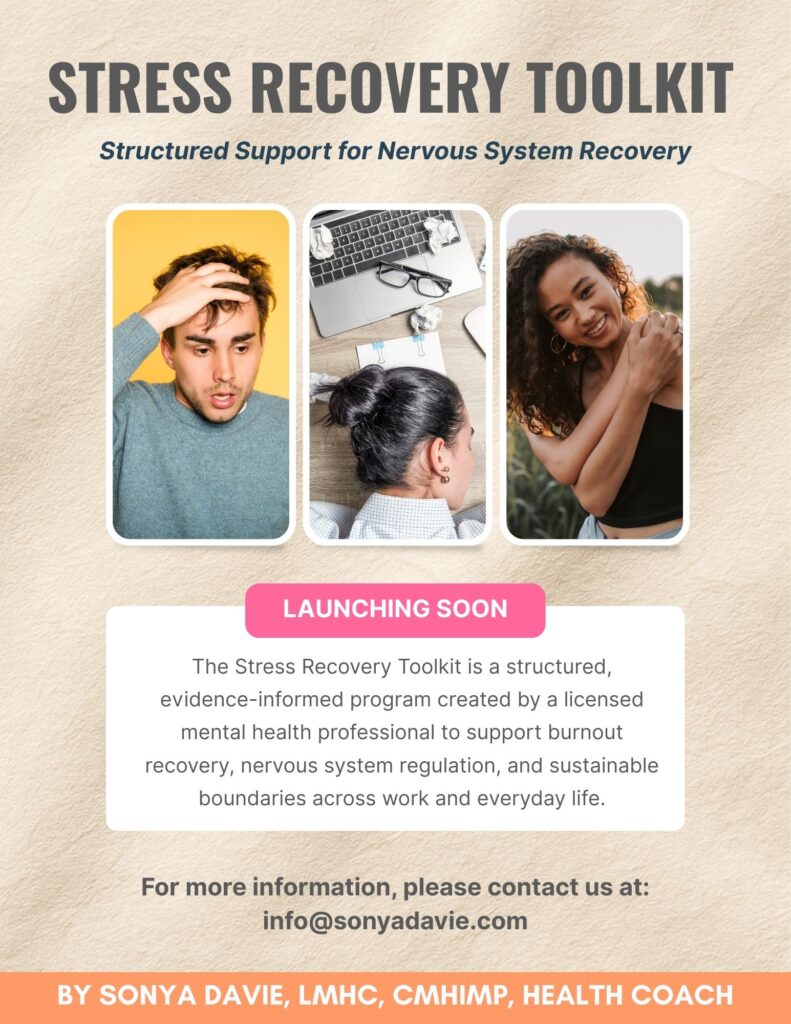 Later this month, the Stress Recovery Toolkit will be launched, a step-by-step, therapist-designed program to help you move from exhausted and overextended to clearer, calmer, and more supported in your energy and boundaries.